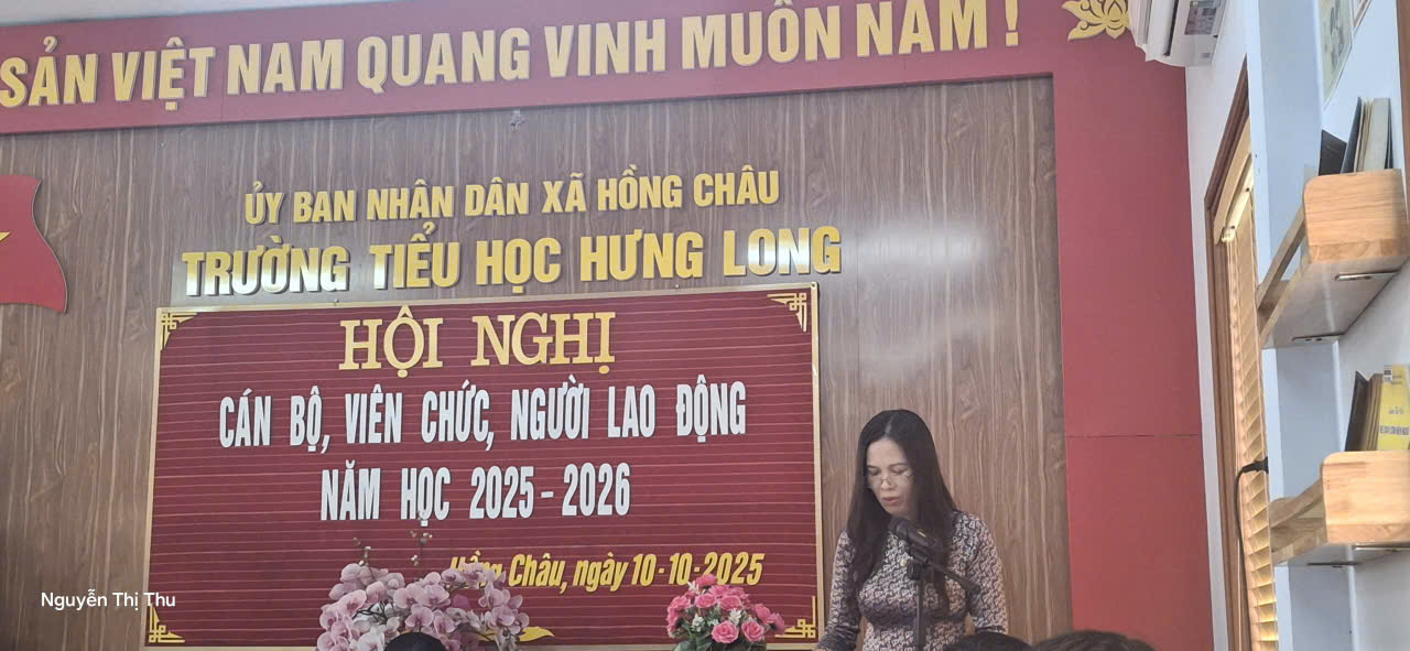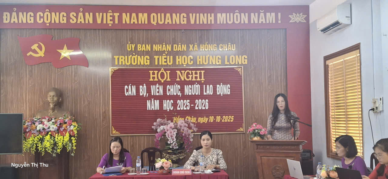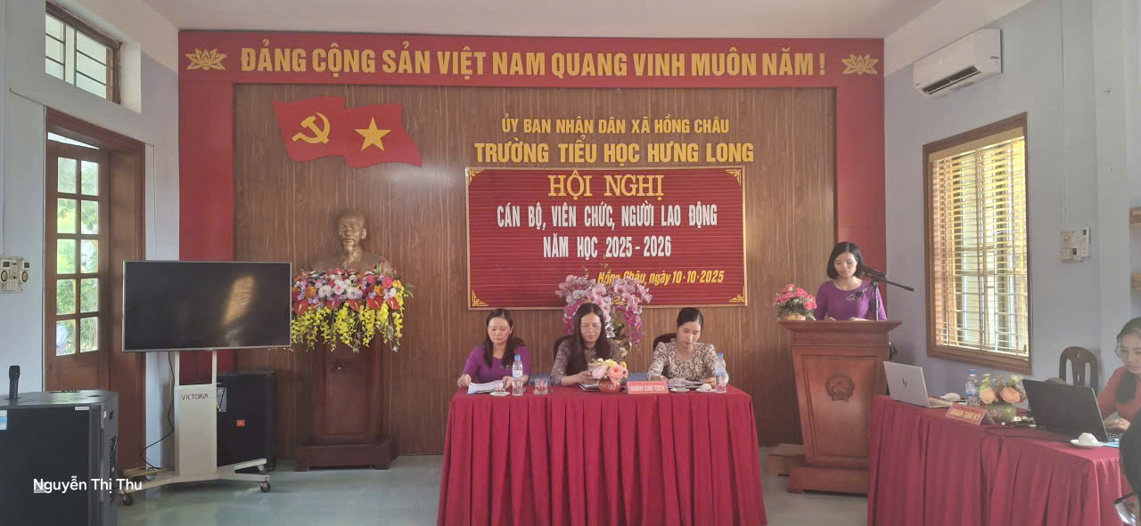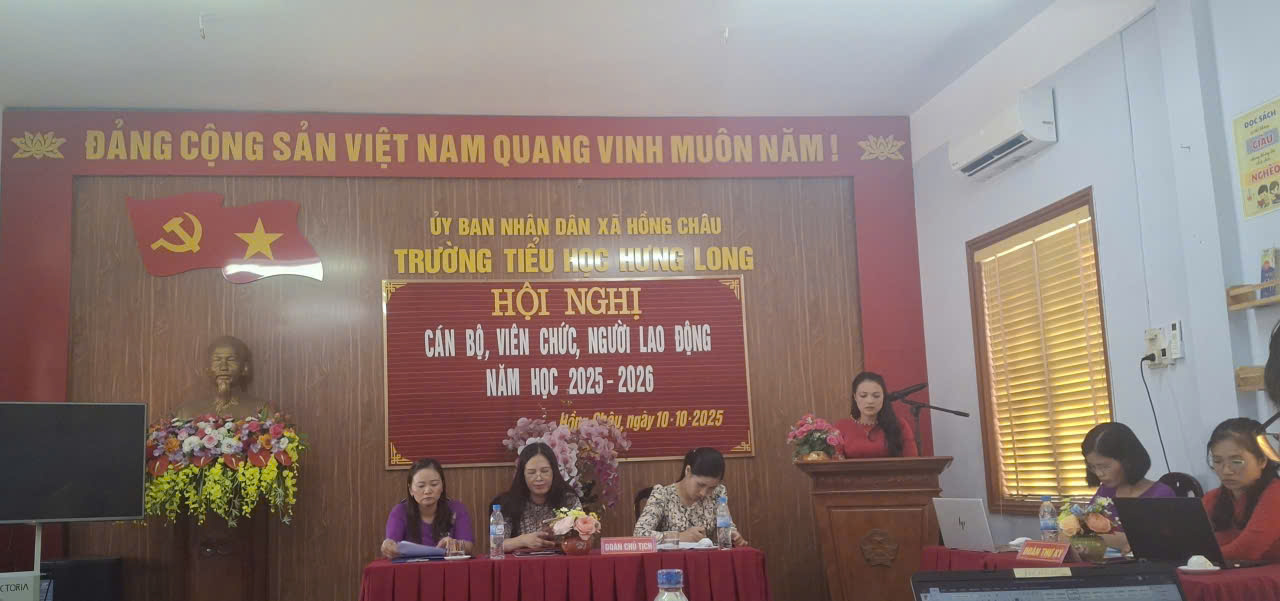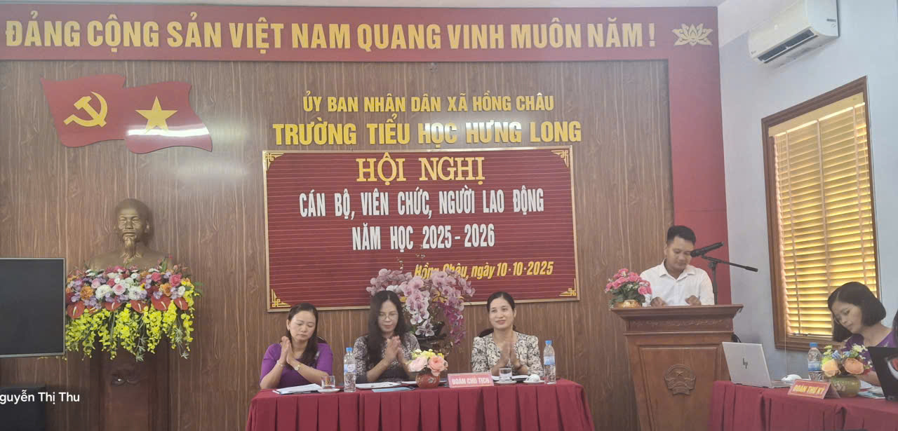Thực hiện công văn số 308 ngày 26 tháng 9 của UBND xã Hồng Châu V/v tổ chức hội nghị cán bộ, viên chức, người lao động năm học 2025-2026; chiều ngày 10 tháng 10 năm 2025, Trường Tiểu học Hưng Long đã long trọng tổ chức hội nghị cán bộ, viên chức, người lao động năm học 2025 - 2026.