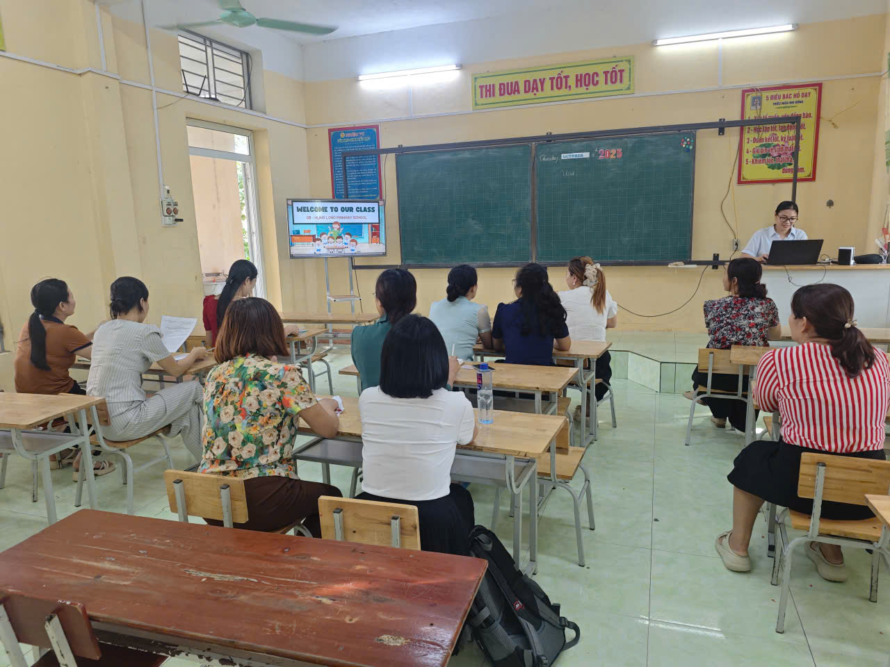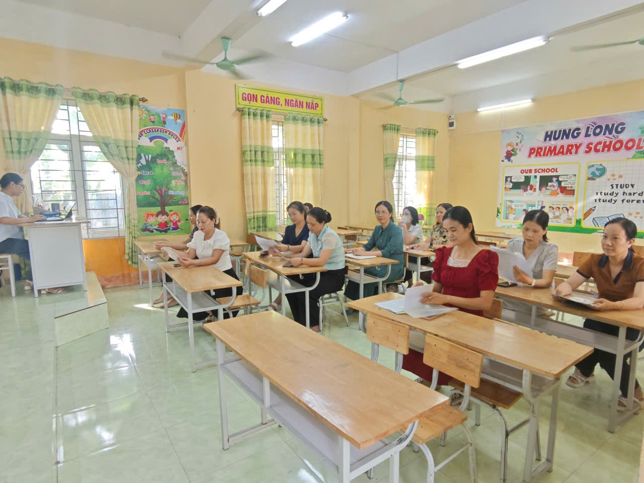 Trong những năm gần đây, công nghệ thông tin đã và đang tạo nên những biến đổi to lớn trong lĩnh vực giáo dục. Đặc biệt, sự xuất hiện và phát triển mạnh mẽ của trí tuệ nhân tạo (AI – Artificial Intelligence) đã mở ra một hướng đi mới trong đổi mới phương pháp giảng dạy và học tập ở nhà trường phổ thông. Đối với môn Tiếng Anh – một môn học giữ vai trò quan trọng trong việc hình thành năng lực giao tiếp quốc tế cho thế hệ trẻ, AI càng chứng tỏ được ưu thế vượt trội trong việc hỗ trợ học sinh rèn luyện kỹ năng ngôn ngữ. Thực hiện kế hoạch nhiệm vụ năm học 2025-2026 của trường Tiểu học Hưng Long, được sự phân công của nhà trường, hôm nay, thứ năm ngày 16 tháng 10 năm 2025, tổ chuyên môn 4-5 đã tổ chức báo cáo lí thuyết chuyên đề cấp trường: “Ứng dụng trí tuệ nhân tạo AI trong dạy học môn Tiếng Anh nhằm nâng cao năng lực giao tiếp tiếng Anh cho học sinh lớp 5”. Trong phần báo cáo lí thuyết, cô Nguyễn Thị Phượng đã đưa ra các mục tiêu rõ ràng, cụ thể mà chuyên đề hướng tới không chỉ dành cho HS mà đối với cả giáo viên, các công cụ AI sử dụng hiệu quả trong trong thiết kế bài giảng như ChatGpt, Canva, Hailuo, Vidu AI,…, khai thác học liệu điện tử Global Speak một cách hiệu quả. Cô giáo Nguyễn Thị Giang đã trình bày kế hoạch bài dạy Unit 4: Our free time activities Lession 1- Activity 1, 2, 3 với các hình ảnh, video được tạo từ AI kết hợp với các kĩ thuật dạy học tích cực làm bài giảng trở nên sinh động, hấp dẫn hơn. Đến dự và chỉ đạo chuyên đề có sự tham gia của cô Bùi Thị Oanh – Hiệu trưởng nhà trường cùng các thầy cô giáo trong nhà trường. Các thầy cô đã tham gia các ý kiến để xây dựng tiết dạy theo đúng tinh thần mà chuyên đề đang hướng đến.