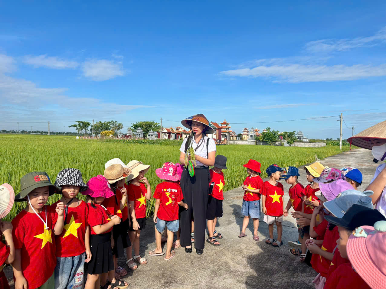 | HOẠT ĐỘNG TRẢI NGHIỆM- THAM QUAN CÁNH ĐỒNG LÚA Trong hành trình nuôi dưỡng tâm hồn trẻ thơ, những hoạt động trải nghiệm thực tế luôn đóng vai trò vô cùng quan trọng. Các bé khối 5 tuổi Trường Mầm non Quyết Thắng đã có một chuyến đi đầy hứng khởi – tham quan cánh đồng lúa chín vàng ngay sau trường. Tại đây, các con được tận mắt quan sát từng bông lúa trĩu hạt, nghe cô giáo giới thiệu về quá trình cây lúa lớn lên từ hạt mầm bé nhỏ đến khi trở thành hạt gạo trắng ngần trong bữa cơm hằng ngày. Các con còn được đi chân trần trên bờ ruộng, chạm tay vào những bông lúa óng vàng, hít thở bầu không khí trong lành của làng quê – những trải nghiệm giản dị mà quý giá. Hoạt động này không chỉ giúp trẻ mở rộng hiểu biết về thiên nhiên, về nghề nông, mà còn khơi gợi trong các con tình yêu lao động, sự trân trọng hạt gạo và công sức của người nông dân. Trẻ hiểu rằng hạt cơm trắng trong bát ăn hàng ngày là kết tinh từ mồ hôi, vất vả của các bác nông dân. Chính vì vậy, các con biết ăn ngoan, ăn hết suất, không làm rơi vãi, không lãng phí để thể hiện lòng biết ơn. Đây chính là những bài học sâu sắc, giúp trẻ trưởng thành hơn mỗi ngày – không chỉ bằng tri thức trong lớp học, mà còn bằng những cảm nhận chân thực từ chính cuộc sống quanh mình. Chuyến tham quan cánh đồng lúa không chỉ mang lại cho các bé niềm vui, sự háo hức mà còn gieo vào tâm hồn non nớt tình yêu quê hương, trân trọng công sức lao động và lòng biết ơn đối với những con người đã làm ra hạt gạo ngọt ngào nuôi dưỡng chúng ta mỗi ngày. Từ những trải nghiệm nhỏ bé hôm nay, thế hệ măng non sẽ lớn lên với trái tim nhân ái, biết yêu người, yêu đất và luôn hướng về quê hương bằng những việc làm ý nghĩa.